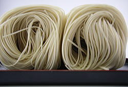 紐を解く所からドキドキ ▲袋を開けると真っ白な乾麺が出てきました。