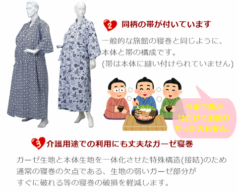 ガーゼ生地と本体生地を一体化させた特殊構造(接結)のため通常の寝巻の欠点である、生地の弱いガーゼ部分がすぐに破れる等の寝巻の破損を軽減します。